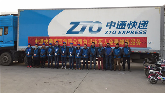 在浙江省桐廬縣,中通快遞集團浙江桐廬公司積極聯(lián)系駐桐武警中隊指導(dǎo)員為退伍官兵免費寄遞行李返鄉(xiāng),這已經(jīng)是桐廬公司今年第二次為該部隊免費寄遞行李了。