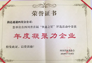 韻達(dá)四川公司榮獲四川省首屆“快遞之星”年度凝聚力快遞企業(yè)