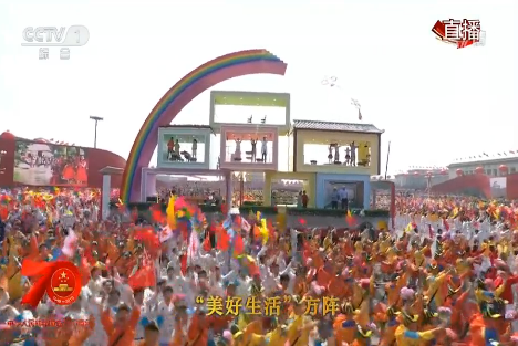 在群眾游行中,千名快遞小哥精彩亮相,他們代表郵政行業(yè)400萬(wàn)從業(yè)者,與廣場(chǎng)舞大媽、環(huán)衛(wèi)工人等組成“美好生活”方隊(duì)。此外,其美多吉也乘坐彩車亮相“凝心鑄魂”方陣。