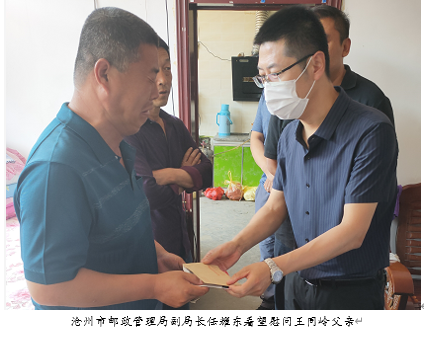 5月28日上午,滄州市郵政管理局副局長任耀東、百世集團(tuán)河北分公司總經(jīng)理于望軍、百世快遞河北分公司總經(jīng)理魏建斌等人趕往泊頭市看望慰問王同嶺父母,于望軍等人還代表百世集團(tuán)為其父母送去一萬元慰問金。