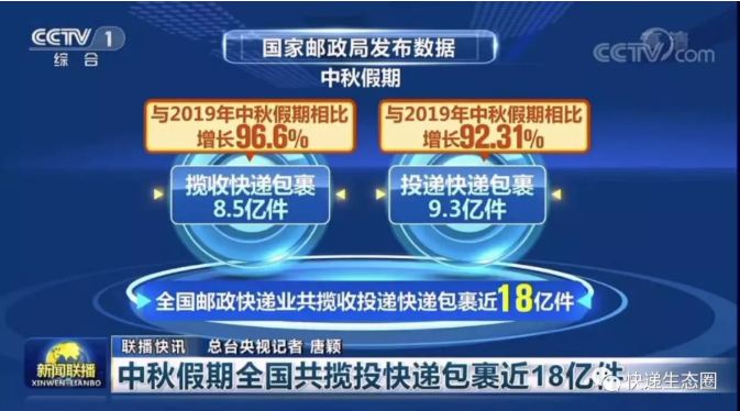 國家郵政局監(jiān)測數(shù)據(jù)顯示,今年中秋假期(9月19日至21日)全國郵政快遞業(yè)運行總體安全、平穩(wěn)有序,共攬收投遞快遞包裹近18億件。其中,攬收快遞包裹8.5億件,與2019年中秋假期相比增長96.6%,日均攬收量與2020年中秋國慶假期相比增長47.33%;投遞快遞包裹9.3億件,與2019年中秋假期相比增長92.31%,日均投遞量與2020年中秋國慶假期相比增長48.63%。