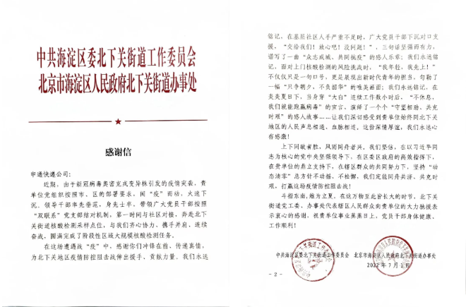 2022年07月04日來源:申通之聲7月1日建黨節(jié)當天,申通快遞北京北下關網(wǎng)點收到了一份感謝信。