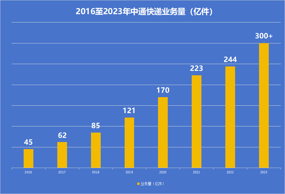 伴隨著中國快遞業(yè)的高速增長,從2016年起,中通快遞業(yè)務(wù)規(guī)模連續(xù)8年保持行業(yè)第一。2019年,中通年業(yè)務(wù)量首次超過100億,此后,中通業(yè)務(wù)規(guī)模連續(xù)保持跨越式發(fā)展,4年內(nèi)連上兩個百億臺階,并且末端門店、快運、云倉、冷鏈、國際等生態(tài)板塊取得穩(wěn)健發(fā)展,綜合物流服務(wù)能力顯著提升。