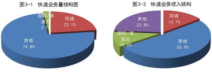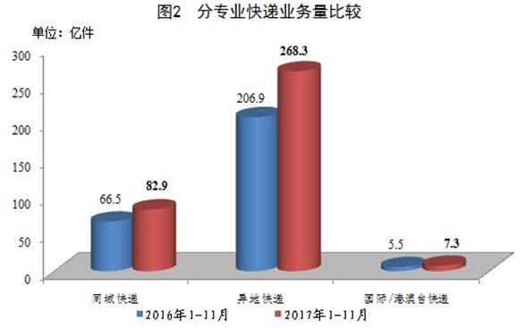1-11月,同城、異地、國際/港澳臺快遞業(yè)務(wù)量分別占全部快遞業(yè)務(wù)量的23.1%、74.8%和2.1%;業(yè)務(wù)收入分別占全部快遞收入的14.7%、50.9%和10.6%。與去年同期相比,同城快遞業(yè)務(wù)量的比重下降0.7個百分點,異地快遞業(yè)務(wù)量的比重上升0.6個百分點,國際/港澳臺業(yè)務(wù)量的比重上升0.1個百分點。