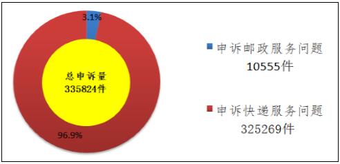 2017年11月,國家郵政局和各?。▍^(qū)、市)郵政管理局通過“12305”郵政行業(yè)消費者申訴電話和申訴網站共受理消費者申訴335824件。申訴中涉及郵政服務問題的10555件,占總申訴量的3.1%;涉及快遞服務問題的325269件,占總申訴量的96.9%。
