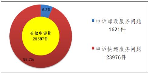 受理的申訴中有效申訴(確定企業(yè)責任的)為25597件,比上年同期增長3.2%。有效申訴中涉及郵政服務問題的1621件,占有效申訴量的6.3%;涉及快遞服務問題的23976件,占有效申訴量的93.7%。