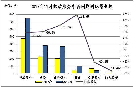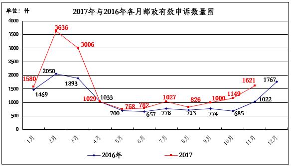2017年11月,消費者關于郵政服務問題的有效申訴1621件,環(huán)比增長41.1%,同比增長58.6%。