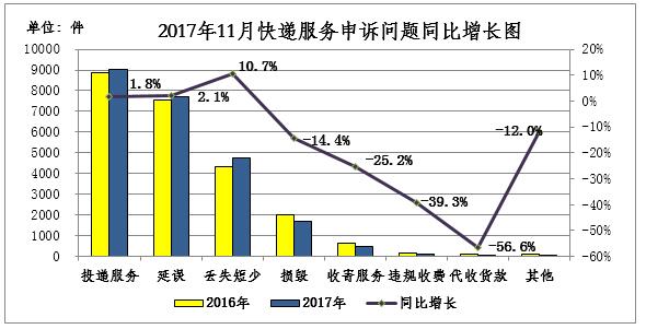 2017年11月,消費者關于快遞服務的有效申訴23976件,環(huán)比增長15.0%,同比增長0.8%。
