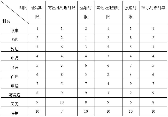 2017年10家快遞服務(wù)品牌主要時(shí)限指標(biāo)排名表現(xiàn)