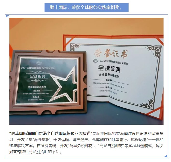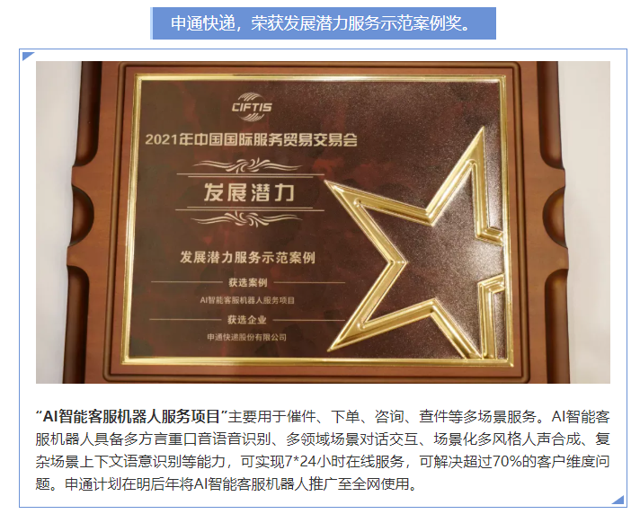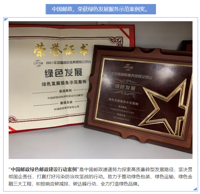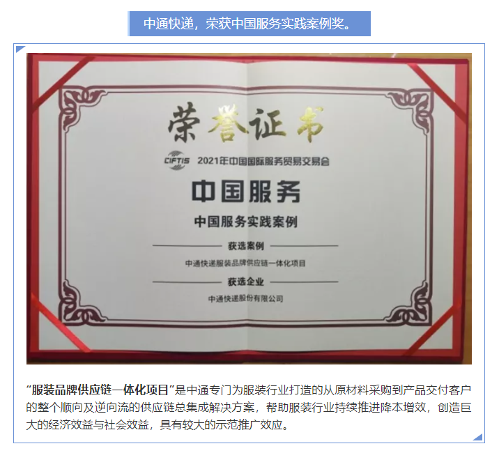 9月4日下午,2021服貿(mào)會服務示范案例頒獎典禮在北京國家會議中心舉辦,會上公布了本屆服貿(mào)會獲選的服務示范案例。中國快遞協(xié)會組織參與的中國郵政、順豐、中通等5家快遞企業(yè)榮獲服務示范案例獎。