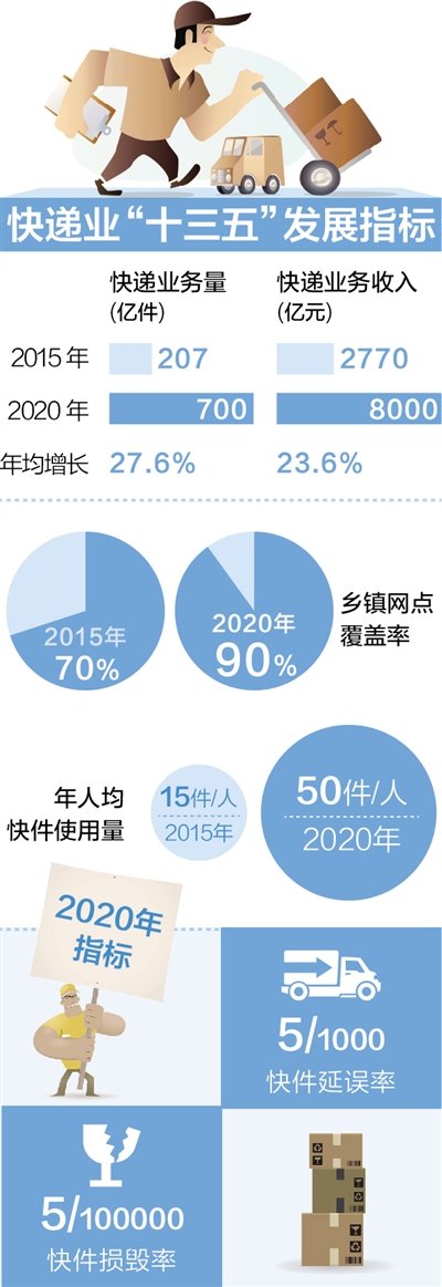 2020年,全國快遞業(yè)務(wù)量達(dá)700億件,快遞業(yè)務(wù)收入8000億元,鄉(xiāng)鎮(zhèn)網(wǎng)點(diǎn)覆蓋率由2015年的70%上升到90%……日前,國家郵政局印發(fā)《快遞業(yè)發(fā)展“十三五”規(guī)劃》(以下簡稱《規(guī)劃》),為2020年的中國快遞業(yè)定了個(gè)“小目標(biāo)”:基本建成普惠城鄉(xiāng)、技術(shù)先進(jìn)、服務(wù)優(yōu)質(zhì)、安全高效、綠色節(jié)能的快遞服務(wù)體系,形成覆蓋全國、聯(lián)通國際的服務(wù)網(wǎng)絡(luò)。“小目標(biāo)”實(shí)現(xiàn)過程中,會遇上哪些大難題?該如何應(yīng)對?記者就此采訪了有關(guān)企業(yè)和專家。
