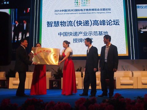 10月31日,2014智慧物流快遞高峰論壇在杭州舉行。中國(guó)快遞協(xié)會(huì)會(huì)長(zhǎng)高宏峰出席論壇并致辭,常務(wù)副會(huì)長(zhǎng)兼秘書長(zhǎng)李惠德與蕭山區(qū)副區(qū)長(zhǎng)馮偉共同為杭州空港智慧物流園區(qū)“中國(guó)快遞物流示范基地”揭牌。浙江郵政管理局局長(zhǎng)王文海參加會(huì)議并講話。