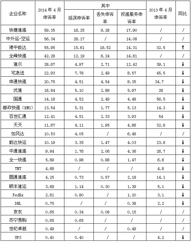 2014年4月主要快遞企業(yè)申訴率表