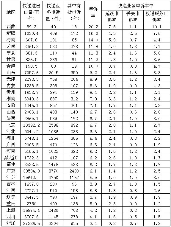 (二)消費(fèi)者對快遞企業(yè)申訴情況