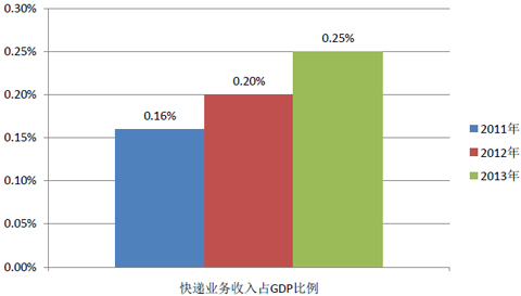 作為第三產(chǎn)業(yè)(服務(wù)業(yè))的重要組成部分,郵政行業(yè)在GDP中的占比逐年攀升,成為拉動(dòng)國(guó)民經(jīng)濟(jì)增長(zhǎng)的積極力量。2013年,郵政業(yè)業(yè)務(wù)收入和業(yè)務(wù)總量分別為2547.8億元和2725.1億元,占GDP比例分別達(dá)到0.44%、0.47%。其中,快遞業(yè)務(wù)收入占GDP比例達(dá)到0.25%,36.6%的增長(zhǎng)率更是GDP增速的近5倍。近三年來(lái),快遞業(yè)務(wù)收入GDP占比已經(jīng)實(shí)現(xiàn)“三連升”。
