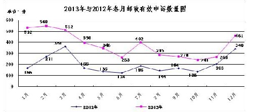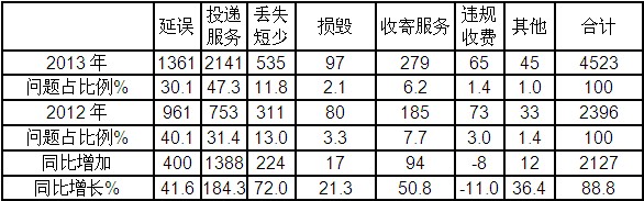 2013年共受理郵政服務(wù)有效申訴4523件,同比增長88.8%。