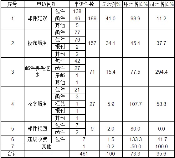 12月,受理消費(fèi)者關(guān)于郵政服務(wù)問題的有效申訴461件,環(huán)比增長73.3%,同比增長35.6%。