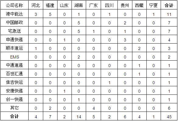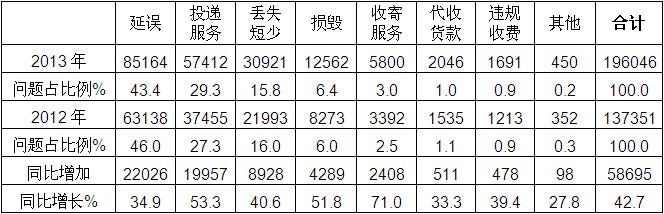 2013年共受理快遞業(yè)務(wù)有效申訴196046件,同比增長42.7%。