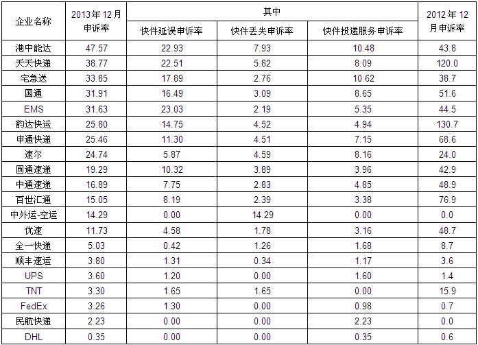 2013年12月主要快遞企業(yè)申訴率表