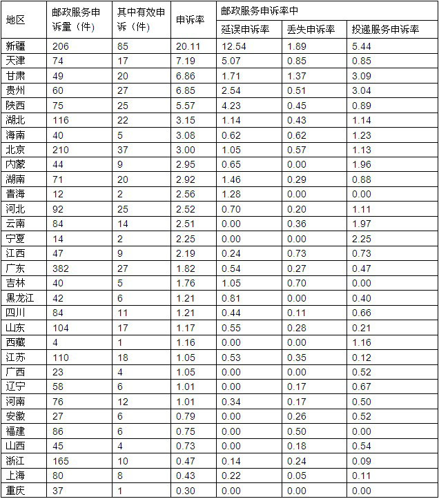 2013年12月各省(區(qū)、市)郵政服務(wù)申訴率表