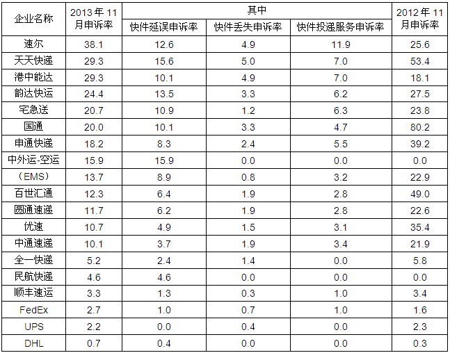 2013年11月主要快遞企業(yè)申訴率表