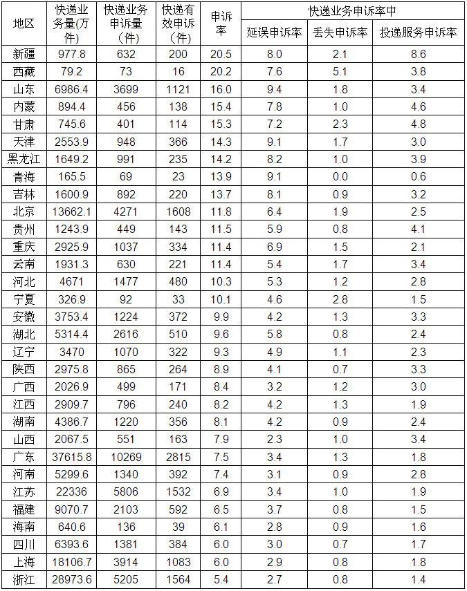 2013年11月各?。▍^(qū)、市)快遞業(yè)務(wù)申訴率表