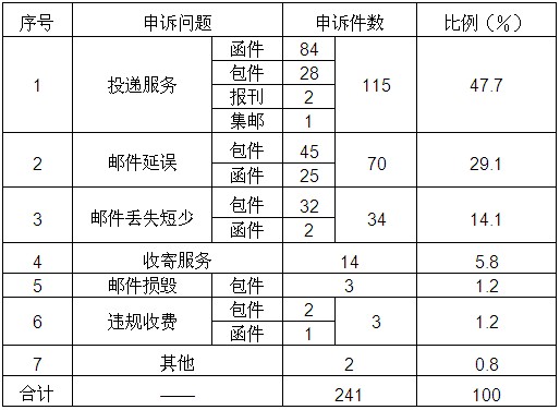 10月,受理消費(fèi)者關(guān)于郵政服務(wù)問題的有效申訴241件,比上月減少29件,下降10.7%。其中,投遞服務(wù)問題115件,占47.7%;郵件延誤70件,占29.1%;郵件丟失及內(nèi)件短少34件,占14.1%;收寄服務(wù)問題14件,占5.8%;郵件損毀3件,占1.2%;違規(guī)收費(fèi)3件,占1.2%;其他問題2件,占0.8%。