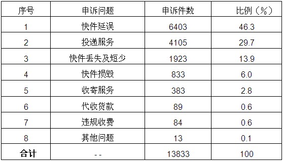 10月,受理消費(fèi)者關(guān)于快遞業(yè)務(wù)的有效申訴13833件。比上月減少174件,下降1.2%。其中,快件延誤6403件,占46.3%;投遞服務(wù)問題4105件,占29.7%;快件丟失及內(nèi)件短少1923件,占13.9%;快件損毀833件,占6%;收寄服務(wù)問題383件,占2.8%;代收貨款問題89件,占0.6%;違規(guī)收費(fèi)84件,占0.6%;其他問題13件,占0.1%。