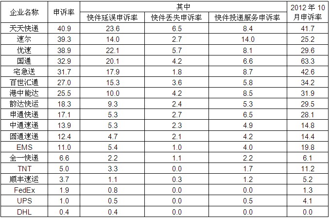 2013年10月主要快遞企業(yè)申訴率表
