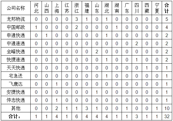 2013年10月,快遞企業(yè)對?。▍^(qū)、市)郵政管理局轉(zhuǎn)辦的申訴未能按規(guī)定時(shí)限回復(fù)的有32件。