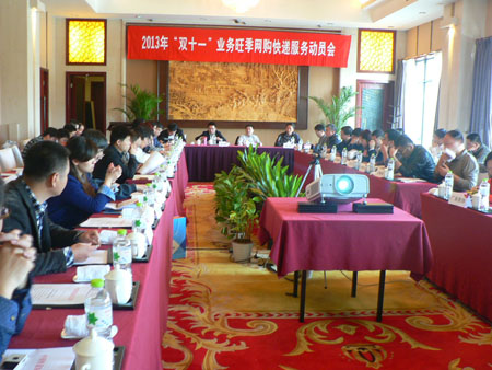 為貫徹落實(shí)國家郵政局馬軍勝局長在部署群眾路線教育實(shí)踐活動下一階段工作會議上的講話精神,10月25日,中國快遞協(xié)會召集快遞企業(yè)和電商平臺,在浙江杭州召開2013年“雙11”業(yè)務(wù)旺季快遞服務(wù)動員大會,動員部署快遞旺季服務(wù)保障工作,協(xié)調(diào)解決快遞與電子商務(wù)在業(yè)務(wù)對接方面存在的瓶頸,切實(shí)保障“雙11”期間快遞服務(wù)的平穩(wěn)運(yùn)行。國家郵政局市場監(jiān)管司、新聞宣傳中心、消費(fèi)者申訴中心、部分?。▍^(qū)、市)快遞行業(yè)協(xié)會等部門參加了本次會議。