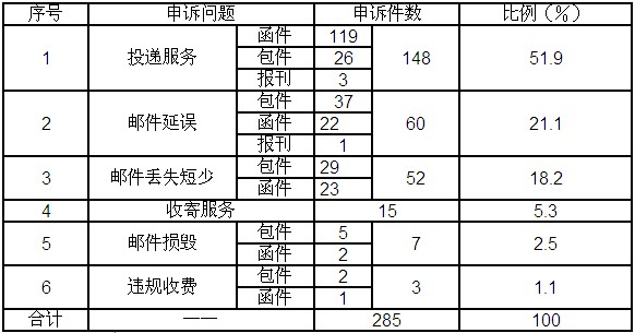 8月,受理消費者關于郵政服務問題的有效申訴285件,比上月減少117件,下降29.1%。其中,投遞服務問題148件,占51.9%;郵件延誤60件,占21.1%;郵件丟失及內件短少52件,占18.2%;收寄服務問題15件,占5.3%;郵件損毀7件,占2.5%;違規(guī)收費3件,占1.1%。