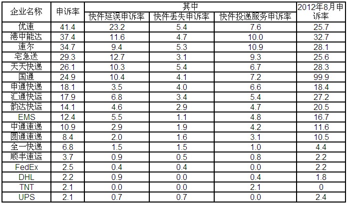 2013年8月主要快遞企業(yè)申訴率表