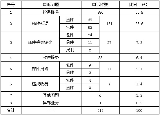 3月,受理消費(fèi)者關(guān)于郵政服務(wù)問題的有效申訴512件,比上月減少36件,下降6.6%。其中,投遞服務(wù)問題286件,占55.9%;郵件延誤131件,占25.6%;郵件丟失及內(nèi)件短少37件,占7.2%;收寄服務(wù)問題33件,占6.4%;郵件損毀11件,占2.1%;違規(guī)收費(fèi)7件,占1.4%;集郵問題1件,占0.2%;其他問題6件,占1.2%。