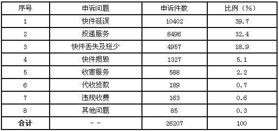 1月,受理消費(fèi)者關(guān)于快遞業(yè)務(wù)的有效申訴26207件。比上月減少7185件,下降21.5%。其中,反映快件延誤的10402件,占39.7%;反映投遞服務(wù)問(wèn)題的8496件,占32.4%;反映快件丟失及內(nèi)件短少的4957件,占18.9%;反映快件損毀的1327件,占5.1%;反映收寄服務(wù)問(wèn)題的588件,占2.2%;反映代收貨款問(wèn)題的189件,占0.7%;反映違規(guī)收費(fèi)的163件,占0.6%;反映其他問(wèn)題的85件,占0.3%。
