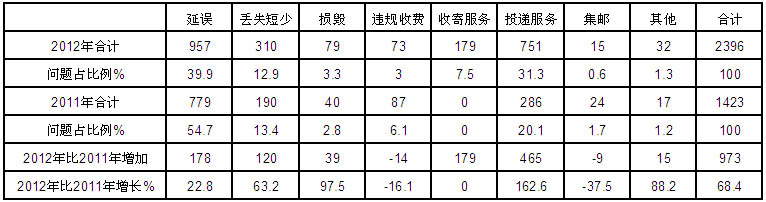 2012年共受理郵政服務有效申訴2396件,占全部有效申訴量的1.7%,比2011年增加973件,增長68.4%。