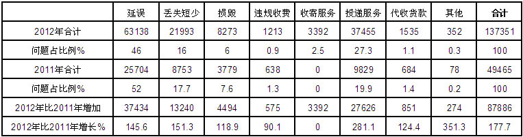 2012年共受理快遞業(yè)務有效申訴137351件,占全部有效申訴量的98.3%,比2011年增加87886件,增長177.7%。