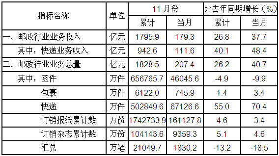 國(guó)家郵政局公布2012年11月份郵政行業(yè)運(yùn)行情況