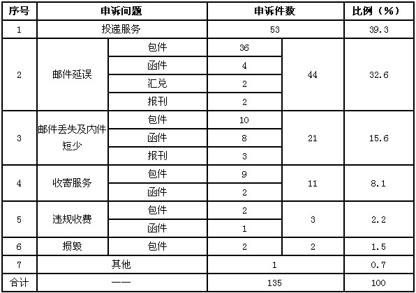 10月,受理消費者關(guān)于郵政服務(wù)問題的有效申訴135件,比上月減少29件,下降17.7%。其中,反映投遞服務(wù)問題的53件,占39.3%;反映郵件延誤的44件,占32.6%;反映郵件丟失及內(nèi)件短少的21件,占15.6;反映收寄服務(wù)問題的11件,占8.1%;反映違規(guī)收費的3件,占2.2%;反映郵件損毀的2件,占1.5%;反映其他問題的1件,占0.7%。