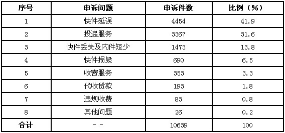 10月,受理消費者關(guān)于快遞業(yè)務(wù)的有效申訴10639件,比上月增加2969件,增長38.7%。其中,反映快件延誤的4454件,占41.9%;反映投遞服務(wù)問題的3367件,占31.6%;反映快件丟失及內(nèi)件短少的1473件,占13.8%;反映快件損毀的690件,占6.5%;反映收寄服務(wù)問題的353件,占3.3%;反映代收貨款問題的193件,占1.8%;反映違規(guī)收費的83件,占0.8%;反映其他問題的26件,占0.2%。