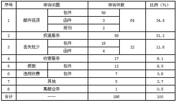 7月,受理消費者關(guān)于郵政服務(wù)問題的有效申訴186件,比上月增加62件,增長50%。其中,反映郵件延誤的64件,占34.4%;反映投遞服務(wù)問題的58件,占31.2%;反映郵件丟失及內(nèi)件短少的22件,占11.8%;反映收寄服務(wù)問題的17件,占9.1%;反映郵件損毀的12件,占6.5%;反映違規(guī)收費的7件,占3.8%;反映其他問題的5件,占2.7%;反映集郵問題的1件,占0.5%。