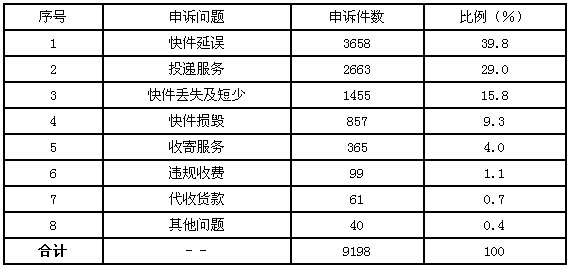 7月,受理消費者關(guān)于快遞業(yè)務(wù)的有效申訴9198件,比上月增加2177件,增長31%。其中,反映快件延誤的3658件,占39.8%;反映投遞服務(wù)問題的2663件,占29%;反映快件丟失及內(nèi)件短少的1455件,占15.8%;反映快件損毀的857件,占9.3%;反映收寄服務(wù)問題的365件,占4%;反映違規(guī)收費的99件,占1.1%;反映代收貨款問題的61件,占0.7%;反映其他問題的40件,占0.4%。