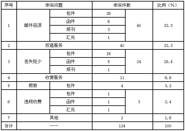 6月,受理消費(fèi)者關(guān)于郵政服務(wù)問題的有效申訴124件,比上月減少12件,下降8.8%。其中,反映郵件延誤的40件,占32.3%;反映投遞服務(wù)問題的40件,占32.3%;反映郵件丟失及內(nèi)件短少的24件,占19.4%;反映收寄服務(wù)問題的11件,占8.9%;反映郵件損毀的4件,占3.2%;反映違規(guī)收費(fèi)的3件,占2.4%;反映其他問題的2件,占1.6%。