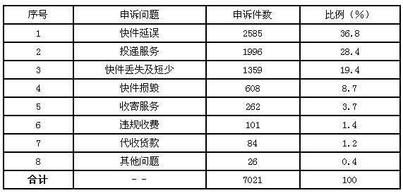 6月,受理消費(fèi)者關(guān)于快遞業(yè)務(wù)的有效申訴7021件,比上月減少1401件,下降16.6%。其中,反映快件延誤的2585件,占36.8%;反映投遞服務(wù)問題的1996件,占28.4%;反映快件丟失及內(nèi)件短少的1359件,占19.4%;反映快件損毀的608件,占8.7%;反映收寄服務(wù)問題的262件,占3.7%;反映違規(guī)收費(fèi)的101件,占1.4%;反映代收貨款問題的84件,占1.2%;反映其他問題的26件,占0.4%。