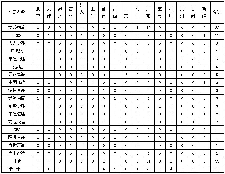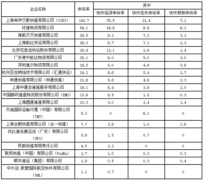 6月,消費(fèi)者對41家快遞企業(yè)進(jìn)行了有效申訴,全國快遞業(yè)務(wù)平均百萬件快件有效申訴15.5件。
