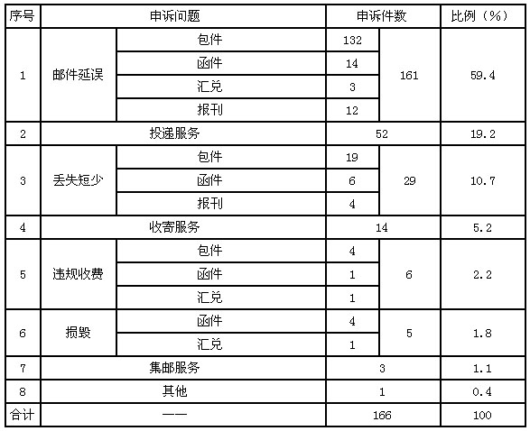 2月,受理消費(fèi)者關(guān)于郵政服務(wù)問(wèn)題的有效申訴271件,比上月增加106件,增長(zhǎng)64.2%。其中,反映郵件延誤的161件,占59.4%;反映投遞服務(wù)問(wèn)題的52件,占19.2%;反映郵件丟失及內(nèi)件短少的29件,占10.7%;反映收寄服務(wù)問(wèn)題的14件,占5.2%;反映違規(guī)收費(fèi)的6件,占2.2%;反映郵件損毀的5件,占1.8%。反映集郵問(wèn)題的3件,占1.1%;反映其他問(wèn)題的1件,占0.4%。