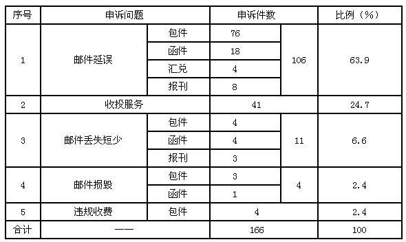 1月,受理消費(fèi)者關(guān)于郵政服務(wù)問(wèn)題的有效申訴166件,比上月減少50件,下降23.2%。其中,反映郵件延誤的106件,占63.9%;反映收投服務(wù)問(wèn)題的41件,占24.7%;反映郵件丟失及內(nèi)件短少的11件,占6.6%;反映郵件損毀的4件,占2.4%;反映違規(guī)收費(fèi)的4件,占2.4%。