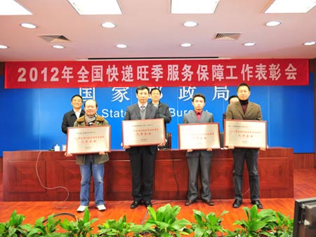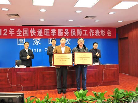 國家郵政局市場監(jiān)管司副司長王豐宣布了國家郵政局的表彰決定,授予郵政速遞物流、順豐速運兩家企業(yè)“2012年全國快遞旺季服務(wù)保障優(yōu)秀企業(yè)”榮譽稱號,授予申通快遞、圓通速遞、中通速遞、韻達快運四家企業(yè)“2012年全國快遞旺季服務(wù)保障先進企業(yè)”榮譽稱號。