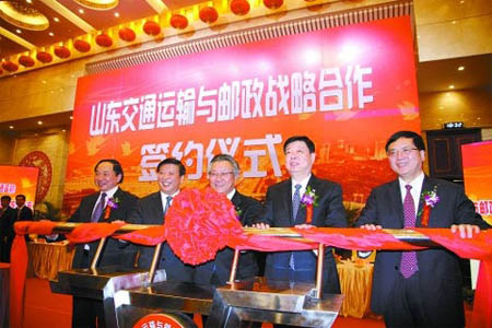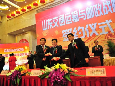 2月15日,在交通運輸部部長李盛霖、山東省委書記姜異康、省長姜大明、國家郵政局副局長徐建洲、中國郵政集團公司總經(jīng)理李國華等領導的見證下,山東交通運輸與郵政戰(zhàn)略合作協(xié)議正式簽署。