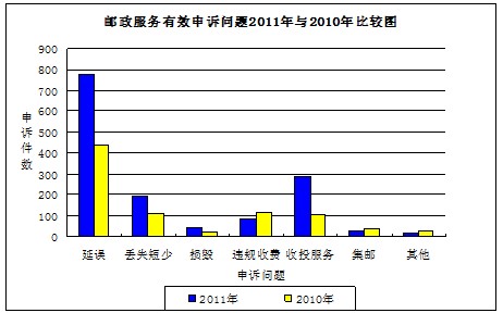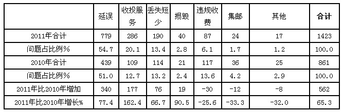 2011年共受理郵政服務(wù)有效申訴1423件,占全部有效申訴量的2.8%,比2010年增加562件,增長(zhǎng)65.3%。